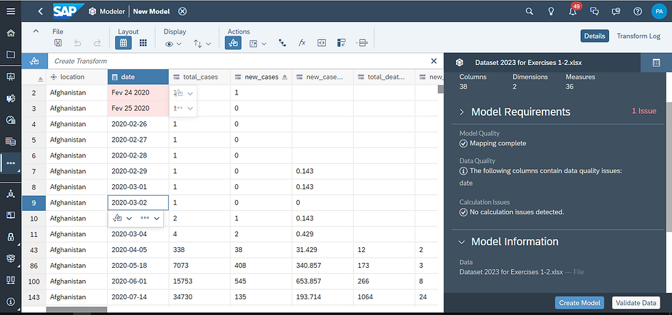 Pada project ini saya mengunakan data set Dataset 2023 for Exercises 1-2.xlsx yang disediakan penyelenggara, dapat dilihat pada gamabar 1 terdapat 1 issue dan terdapat keterangan pada Data Quality yang menunjukkan columns data mengalami issue sehingga perlu dimodifikasi.